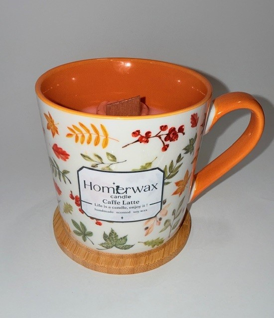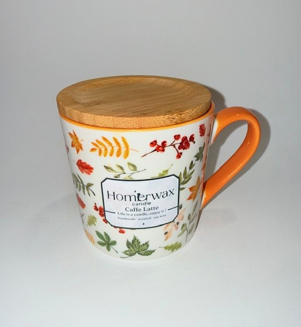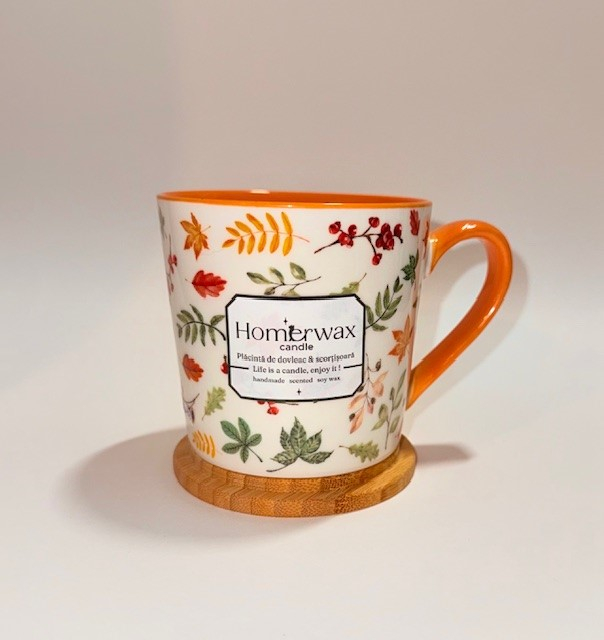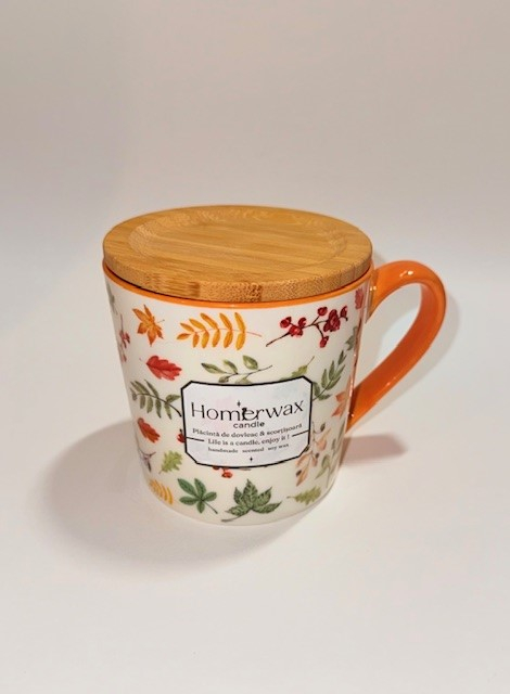 Homer Wax Lumanare parfumata din ceara de soia, in cana din ceramica cu model de sezon – colectia de toamna – Fosnet de frunze