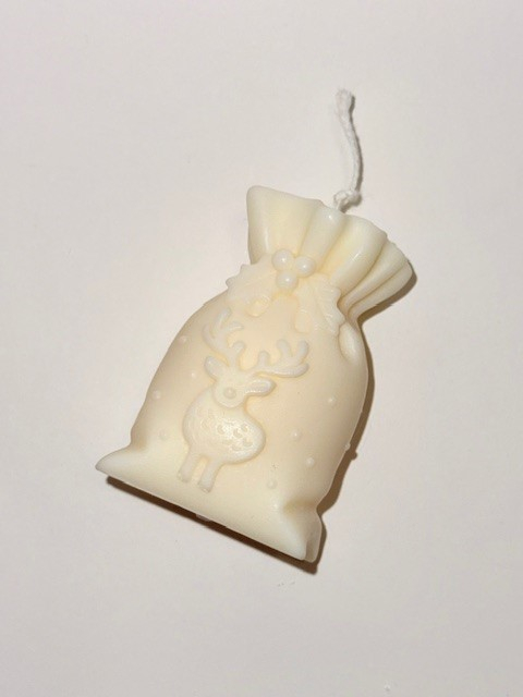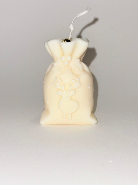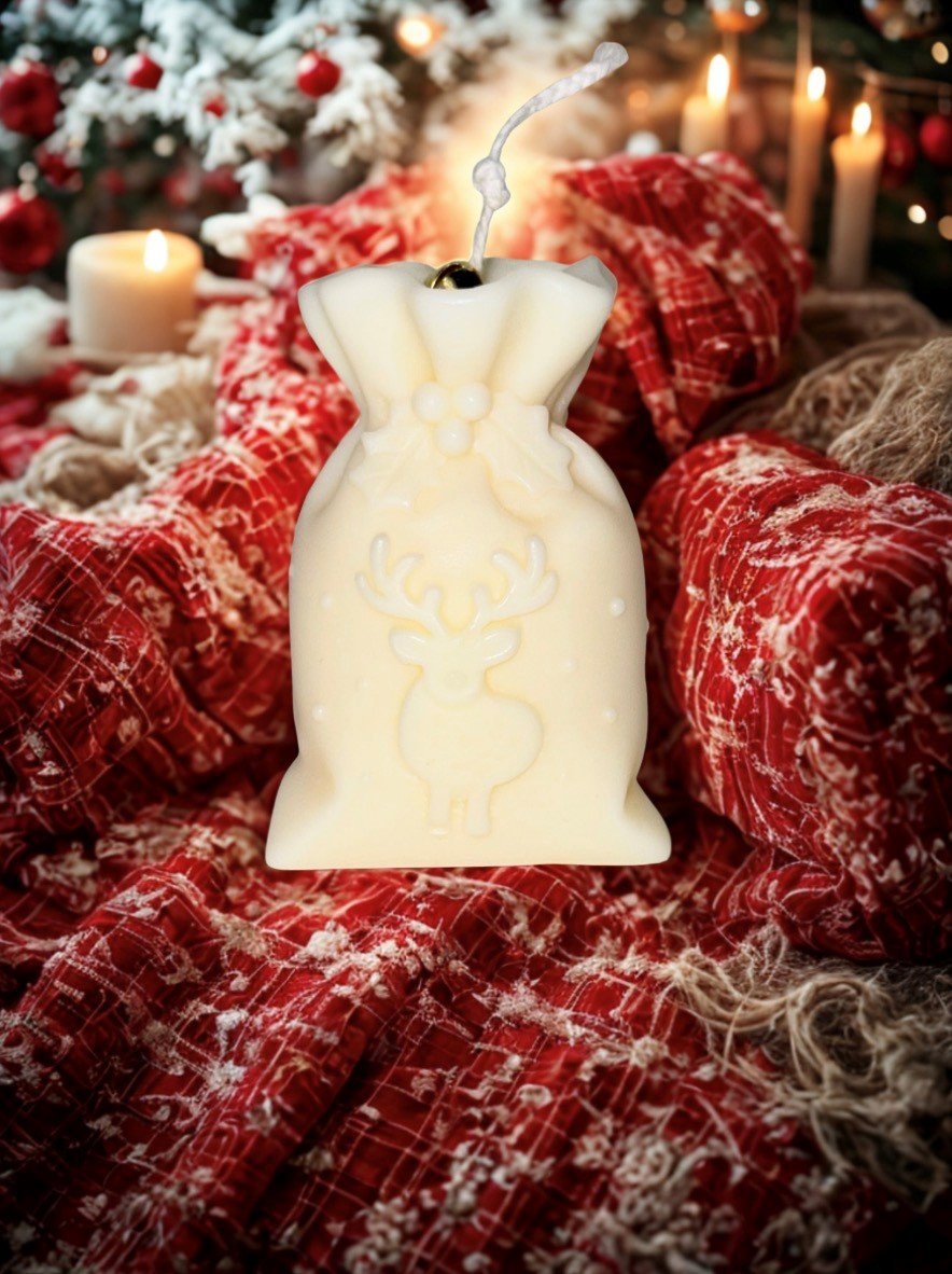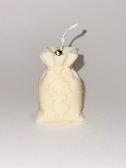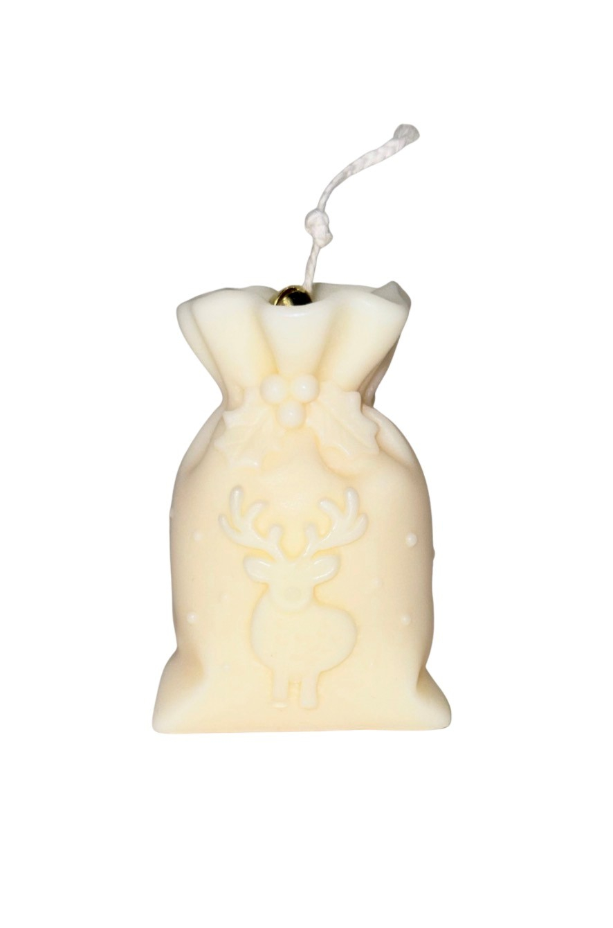Lumanare decorativa parfumata din ceara de soia - Sacul lui Mos Craciun cu model REN, 72 grame, contine un clopotel auriu.